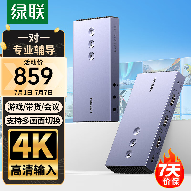 绿联(UGREEN)HDMI双路视频采集卡4K输入 适用手机笔记本电脑相机摄像机2路同显网络教学会议抖音游戏直播录制盒价格:859.00元!
