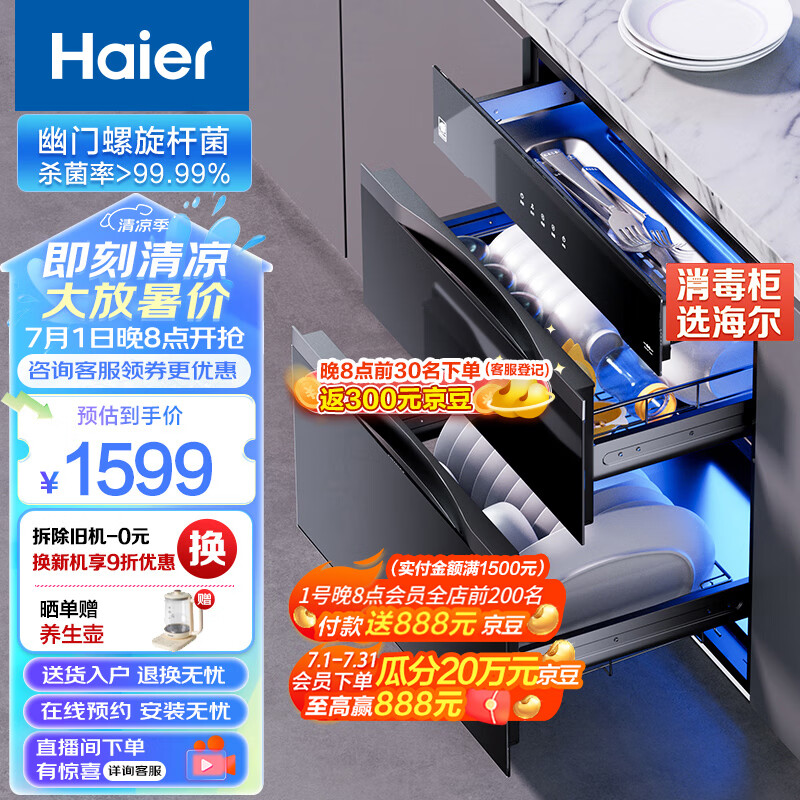 海尔(Haier)消毒柜家用嵌入式 消毒碗柜 奶瓶消毒烘干一体机 光波巴氏消毒新升级 母婴童锁 110L三门三抽EB031价格:1599.00元!