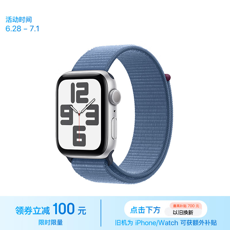 Apple/苹果 Watch SE 2023款智能手表GPS款44毫米银色铝金属表壳凛蓝色回环式运动型表带 MREF3CH/A价格:2199.00元!