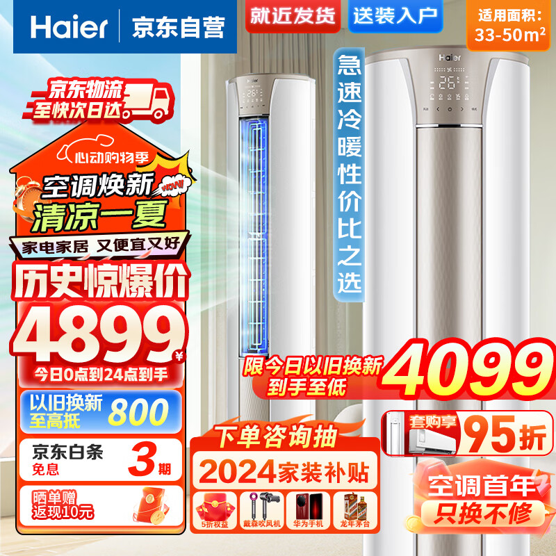 海尔(Haier)空调3匹3级能效静悦变频新能效客厅圆柱空调立式柜机自清洁 京东小家智能快速制冷智能物联72KCA83价格:4899.00元!