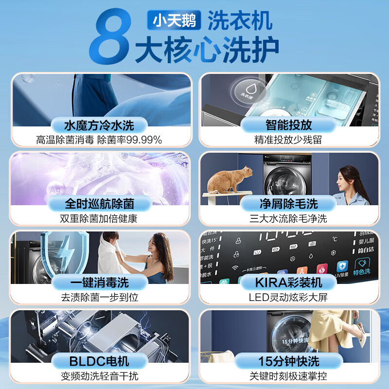 特色功能:智能投放,电辅加热洗涤,儿童锁,防缠绕,空气洗,筒自洁,脱水功能,中途添衣