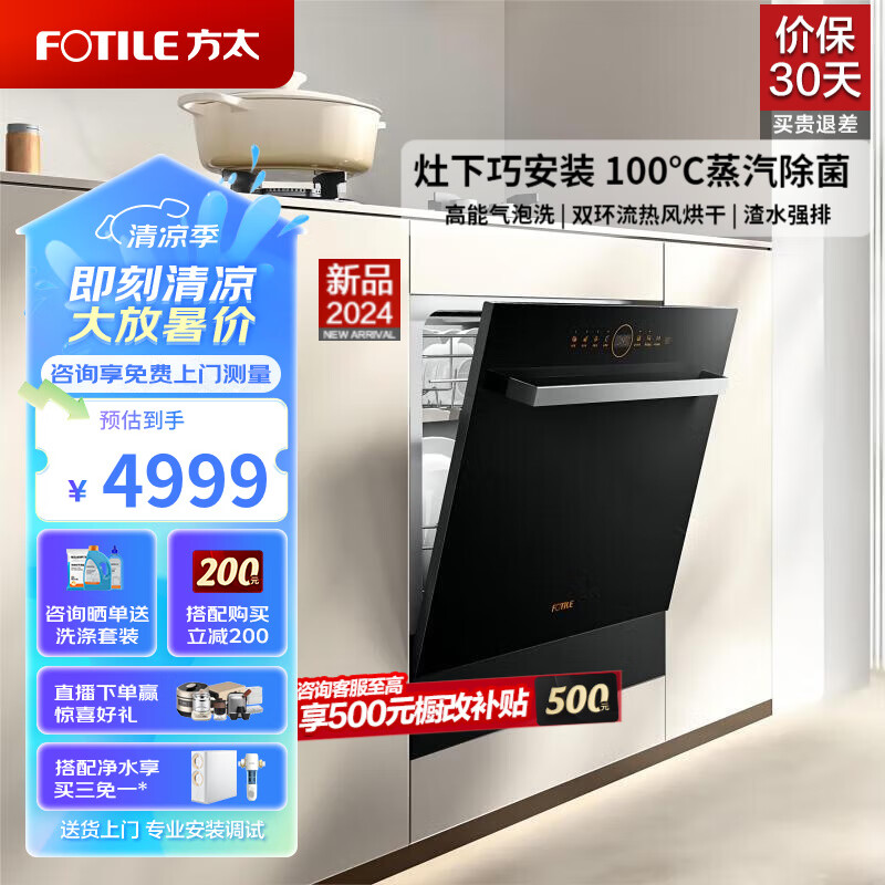 方太(FOTILE)洗碗机N1S 13套大容量 家用嵌入式灶下安装 100°全域蒸汽除菌 洗消烘除存 一级水效 NT01S 13套黑色NT01S 智控升级款价格:4999.00元!