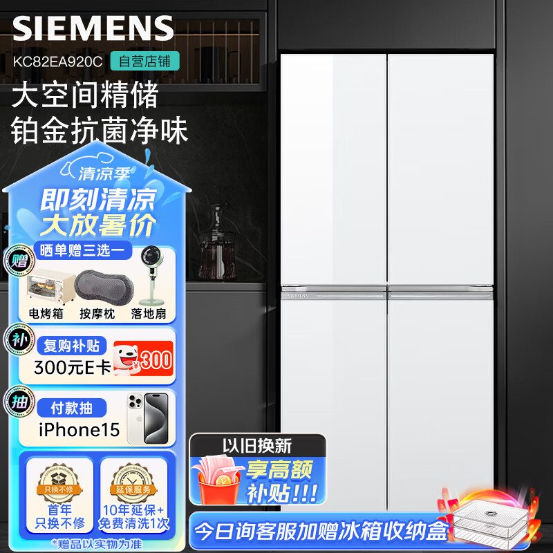 西门子冰箱十字对开门550升超薄可嵌入分区精储变温保鲜家用大容量白色玻璃面板冰箱KC82EA920C价格:8889.00元!