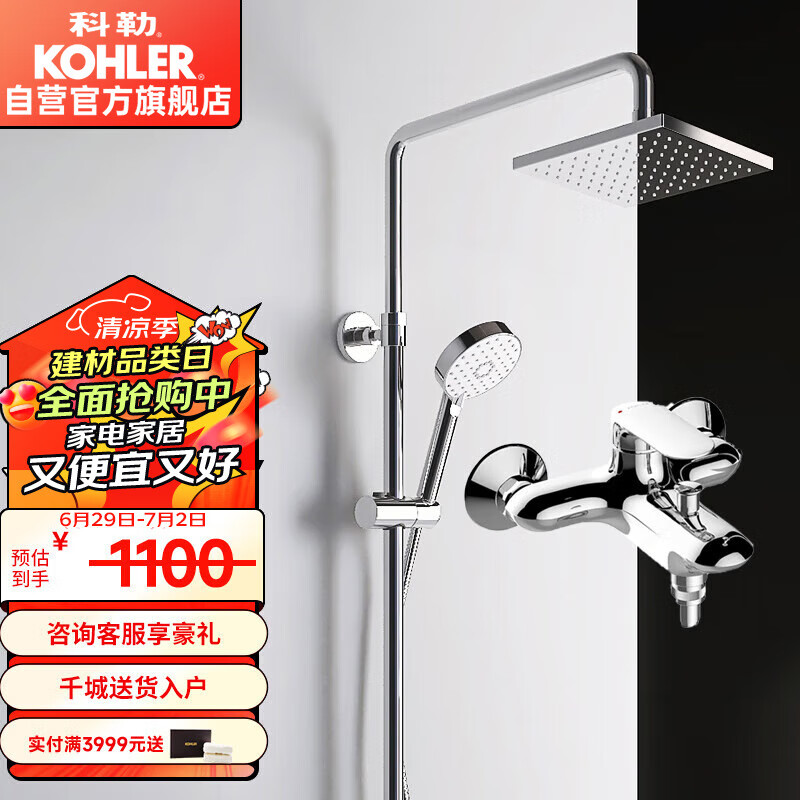 科勒(KOHLER)淋浴花洒套装三出水淋浴柱方型顶喷多功能可升降 性价比款77365T价格:1374.00元!
