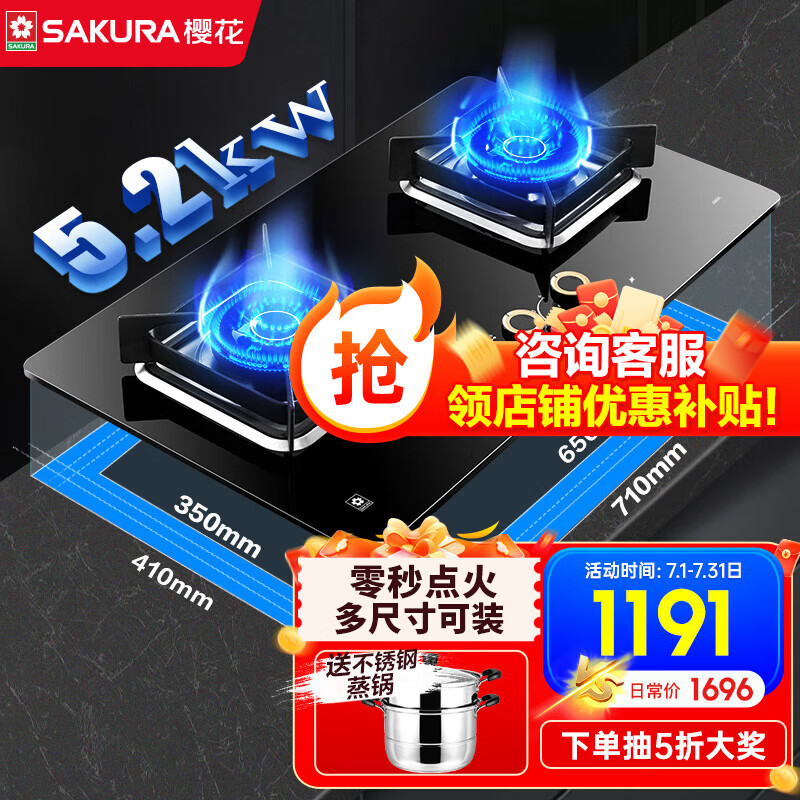 樱花(SAKURA)燃气灶天然气灶大火力液化气灶具家用双灶一级能效嵌入式台式零秒瞬时点火大面板 JGE01【天然气】5.2KW猛火灶多开孔尺寸安装价格:1696.00元!
