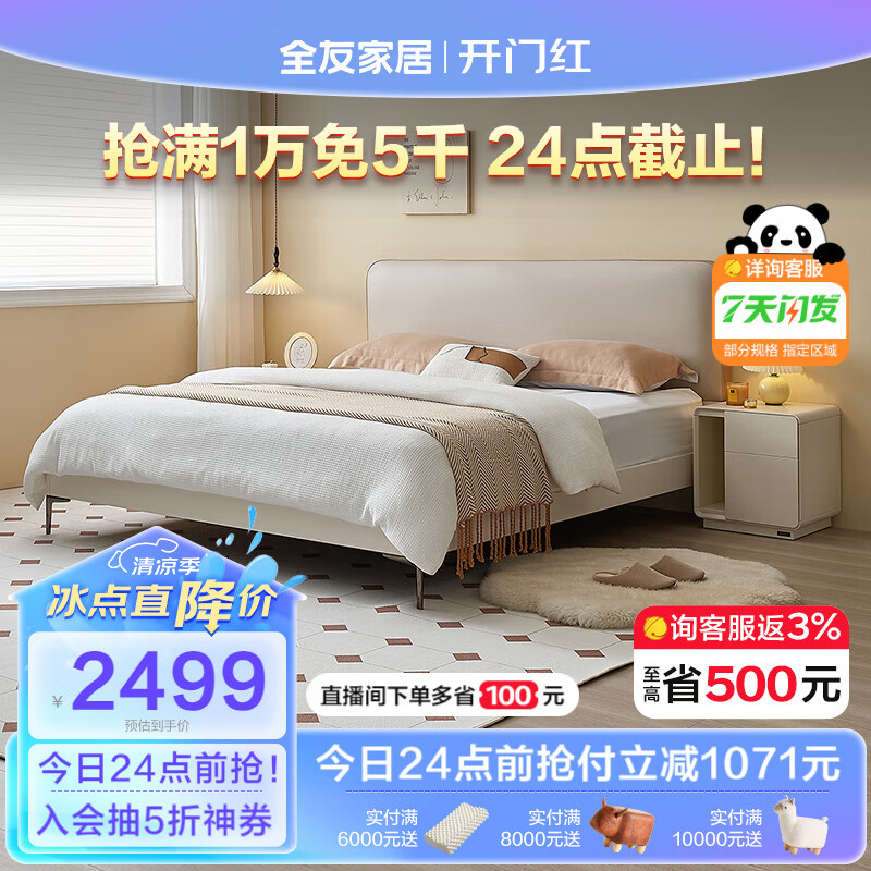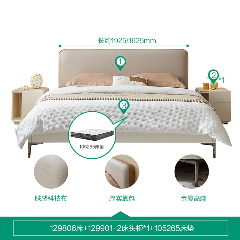全友家居 科技布软包床简约现代奶油风主卧室床1.8米双人大床129806价格:3570.00元!