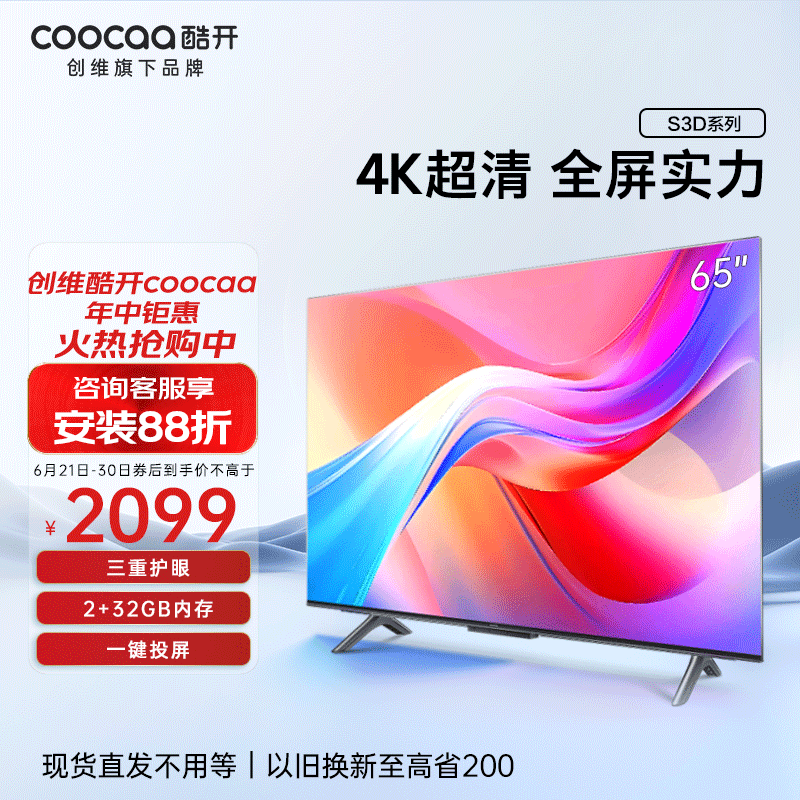 酷开(coocaa)创维电视 S3D 65英寸 2+32GB内存 4K超高清 护眼防蓝光 智能语音 游戏液晶电视机 以旧换新 65P3D 65英寸价格:2099.00元!