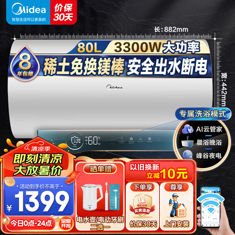 美的(Midea)家用电热水器80升储水式 3300W变频 终身免换镁棒 零电洗一级节能 智能家电 F8032-JA5(HE)价格:1399.00元!