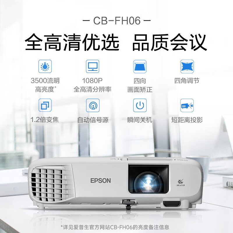 爱普生(EPSON)CB-FH06 投影仪 投影机办公 培训(1080P全高清 3500流明 支持侧投 )价格:5299.00元!