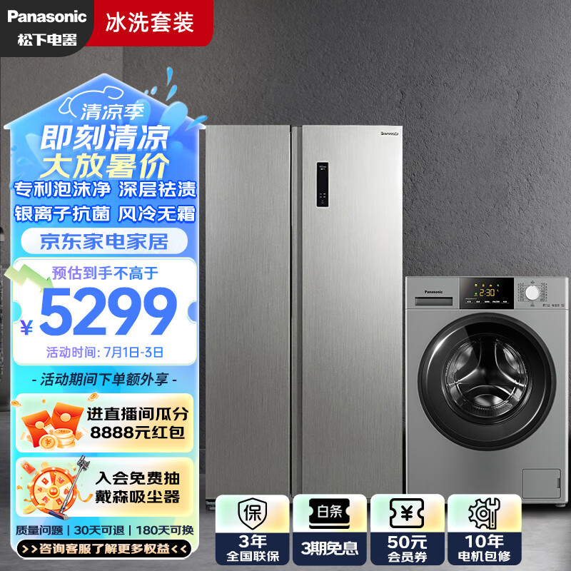 松下(Panasonic)冰洗套装 10kg全自动滚筒洗衣机 泡沫净 户外服洗+570升大容量冰箱 对开门风冷无霜3N1S+JW59MSB-S价格:5869.00元!