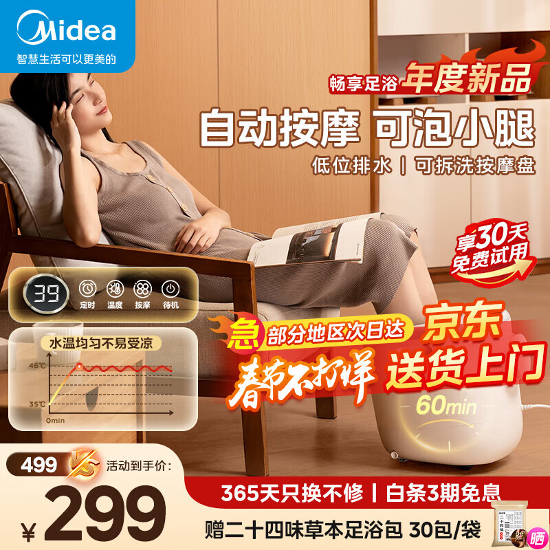 美的泡脚桶足浴盆全自动按摩洗脚盆智能电动加热恒温定时冬季送长辈父母年货生日礼物女生ZL1 电动按摩+防漏电保护【暖阳白】价格:499.00元!