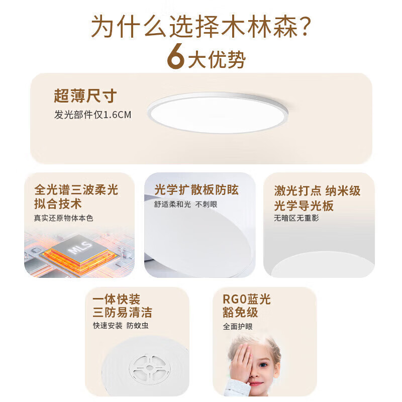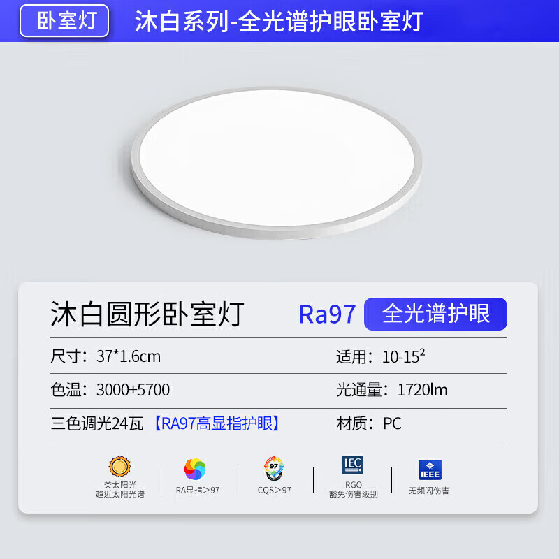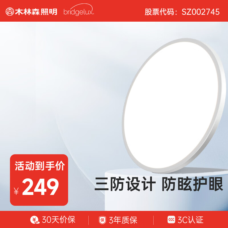 木林森照明超薄护眼吸顶灯卧室灯儿童房全光谱LED防蓝光防频闪 沐白小圆 24w价格:249.00元!