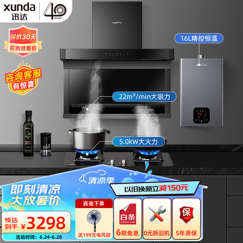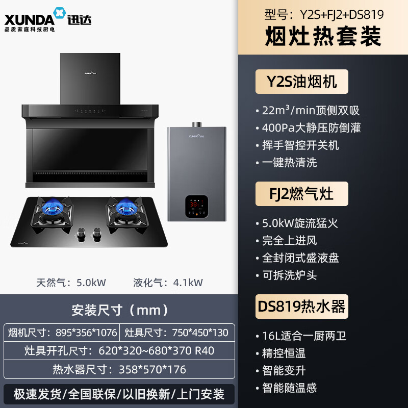 迅达(XUNDA)烟灶热三件套 22立方顶侧双吸油烟机 5.0KW燃气灶 16L燃气热水器 Y2S+FJ2+DS819(天)价格:3498.00元!