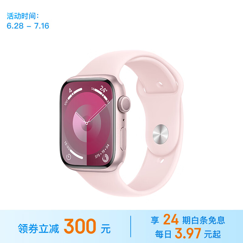 Apple【24期免息】Watch Series 9智能手表GPS款45毫米粉色铝金属表壳亮粉色表带M/L MR9H3CH/A价格:3199.00元!