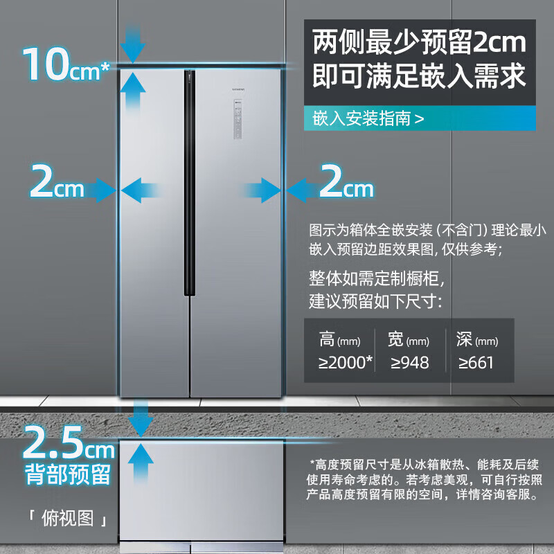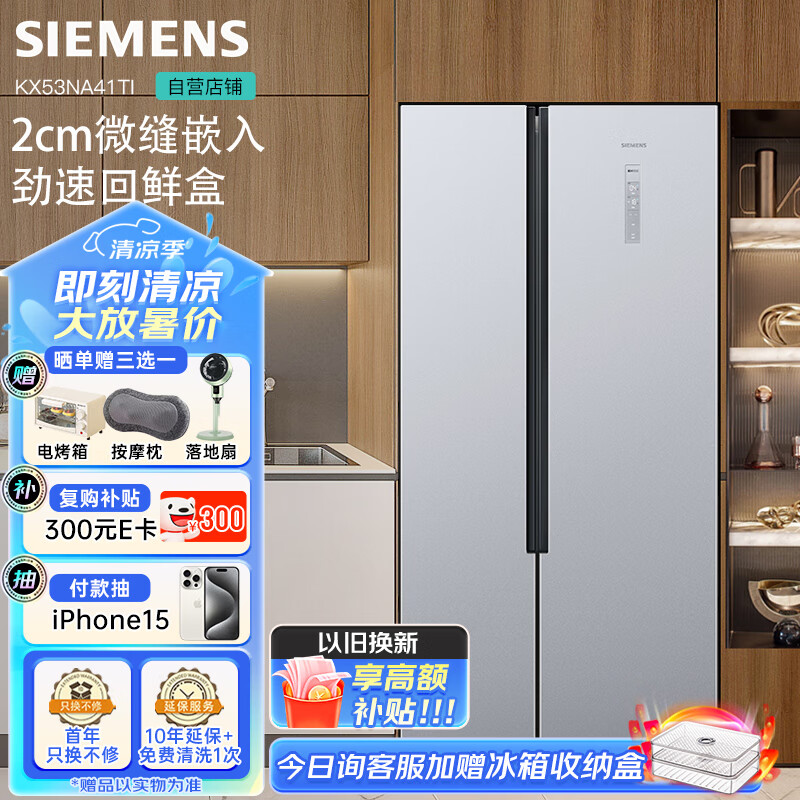 西门子冰箱530升对开门变频大容量微缝嵌入风冷无霜家用纤薄电冰箱带旋转制冰盒KX53NA41TI价格:5889.00元!