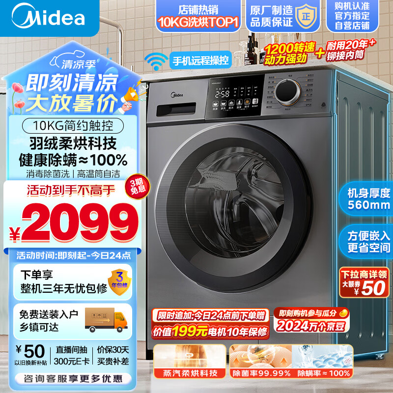 美的(Midea)滚筒洗衣机全自动 洗衣机带烘干洗烘一体机 洗衣机排名前十名 除菌净螨 简尚 10公斤 MD100V33WY价格:2099.00元!