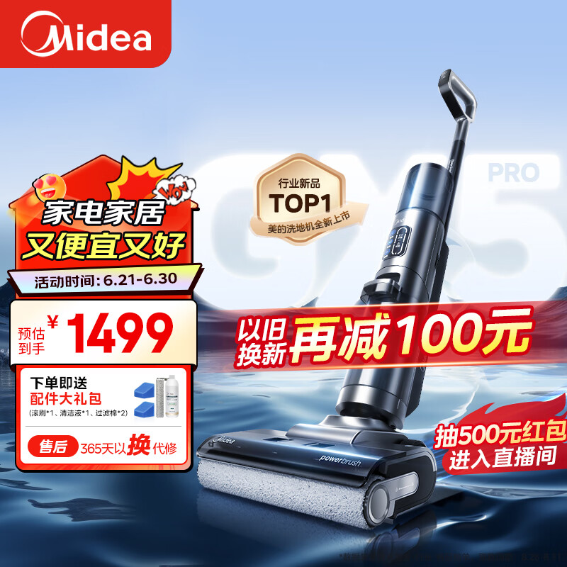 美的(Midea)洗地机GX5pro 【实时电解水除菌】无线家用吸尘洗拖一体机拖地机 自清洁三贴边防缠绕洗地机价格:1499.00元!