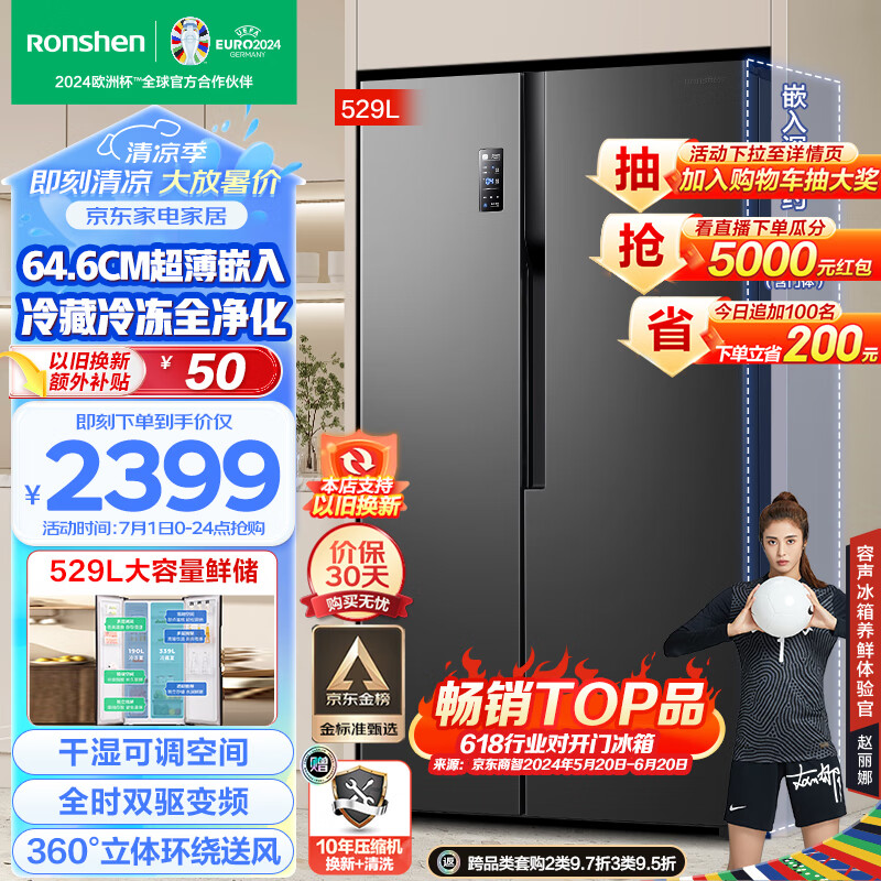容声(Ronshen)离子净味529升变频一级能效对开门双开门冰箱家用无霜除菌BCD-529WD18HP超薄嵌入式大容量价格:2599.00元!