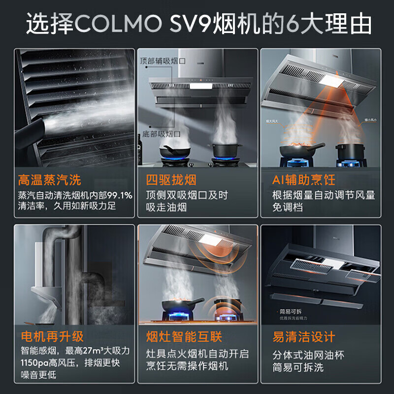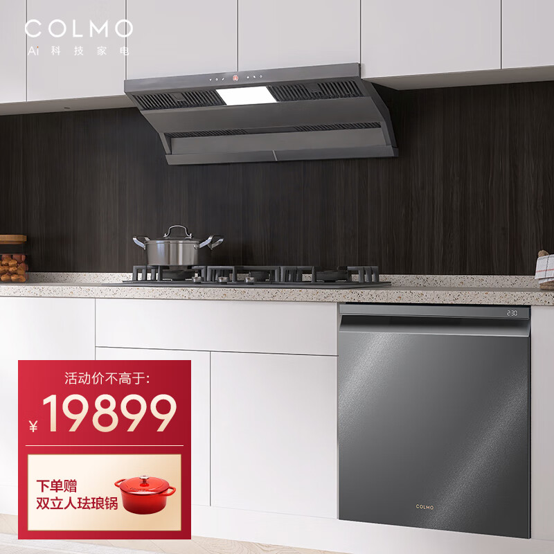 COLMO 厨房烟灶洗三件套 18套三层储存洗碗机 27大风量 三灶齐烹 高温蒸汽洗烟灶套装SK33+SV9+QF6G价格:21899.00元!