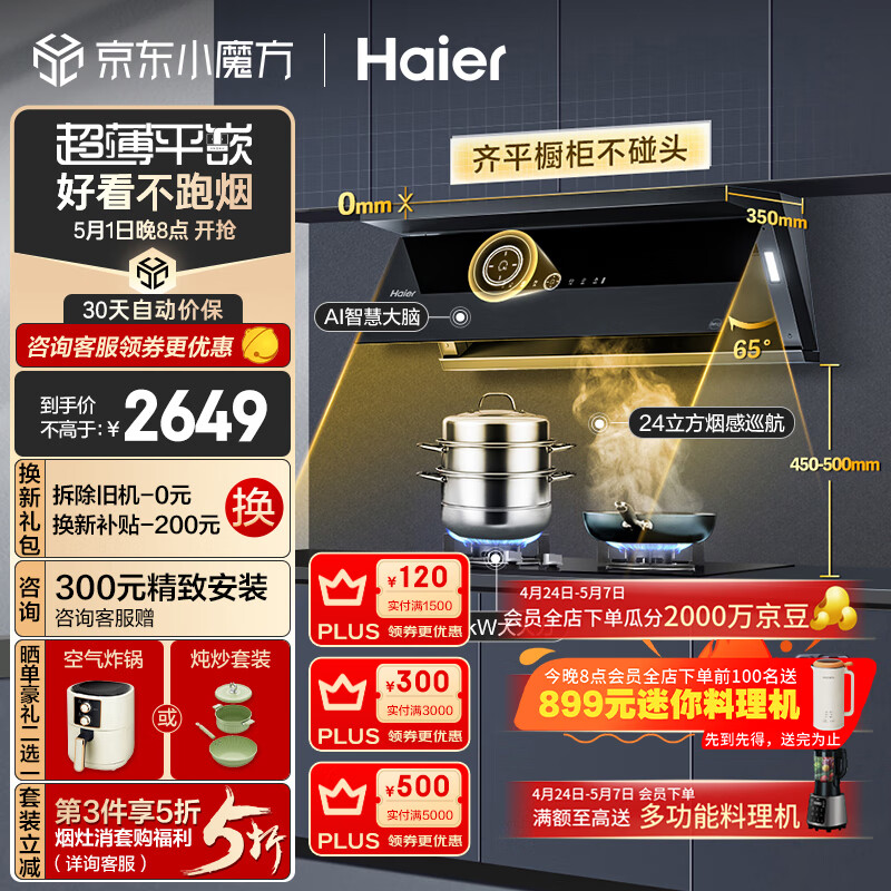 海尔(Haier)抽油烟机 超薄近吸烟灶套装 24m3/min有效风顶侧双吸外观 家用厨房吸油烟机燃气灶具C30+Q2BE2天价格:2649.00元!