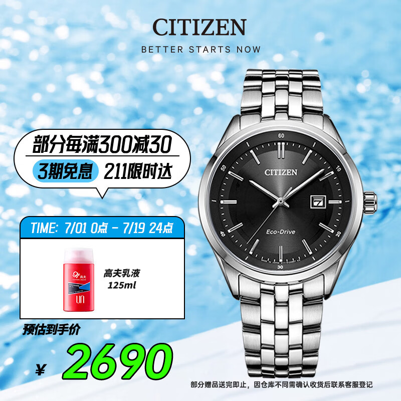 西铁城(CITIZEN)手表男日韩表光动能黑盘日显钢带商务时尚父亲节礼物BM7250-56E价格:2970.00元!