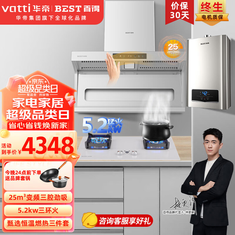百得(BEST)华帝出品 厨房多件套 顶侧双吸式家用抽油烟机燃气灶具燃气热水器套装 E710+QE72+DR09-16(天然气)价格:4548.00元!