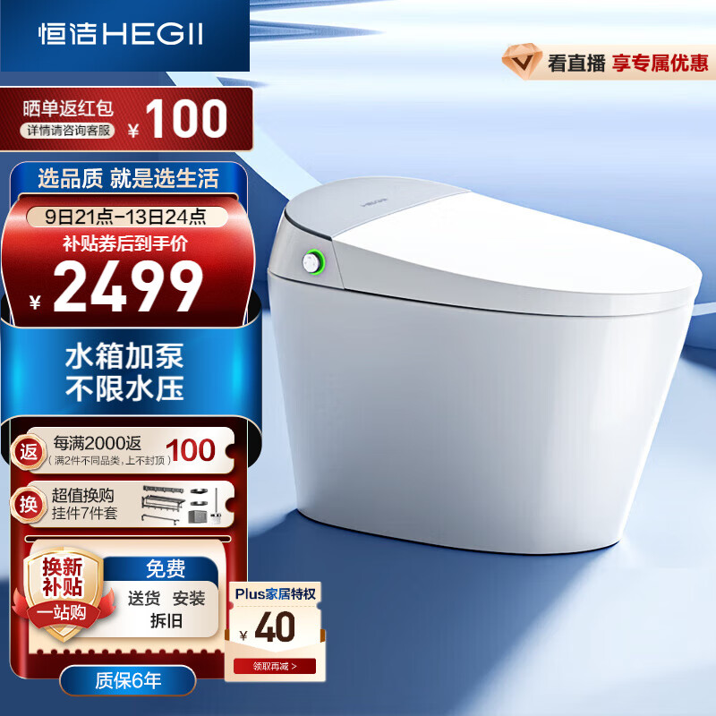 恒洁(HEGII)智能马桶H33 内置水箱不限水压抗菌智能坐便器HCE865A01-400mm价格:3609.00元!