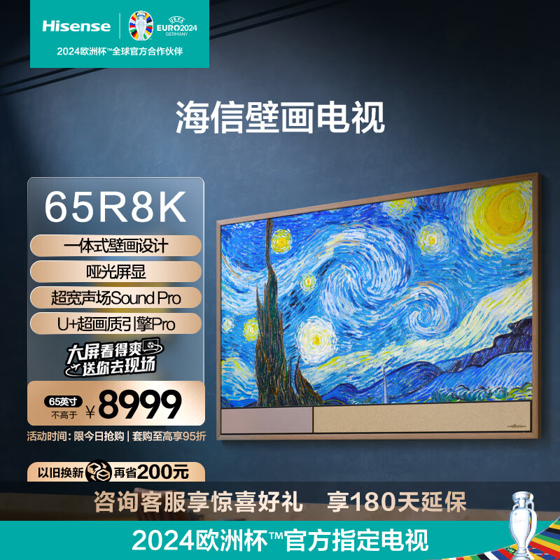 海信壁画电视R8K 65R8K 65英寸 一体式壁画设计 艺术电视 哑光屏显 超宽声场Sound Pro电视机 欧洲杯价格:8999.00元!