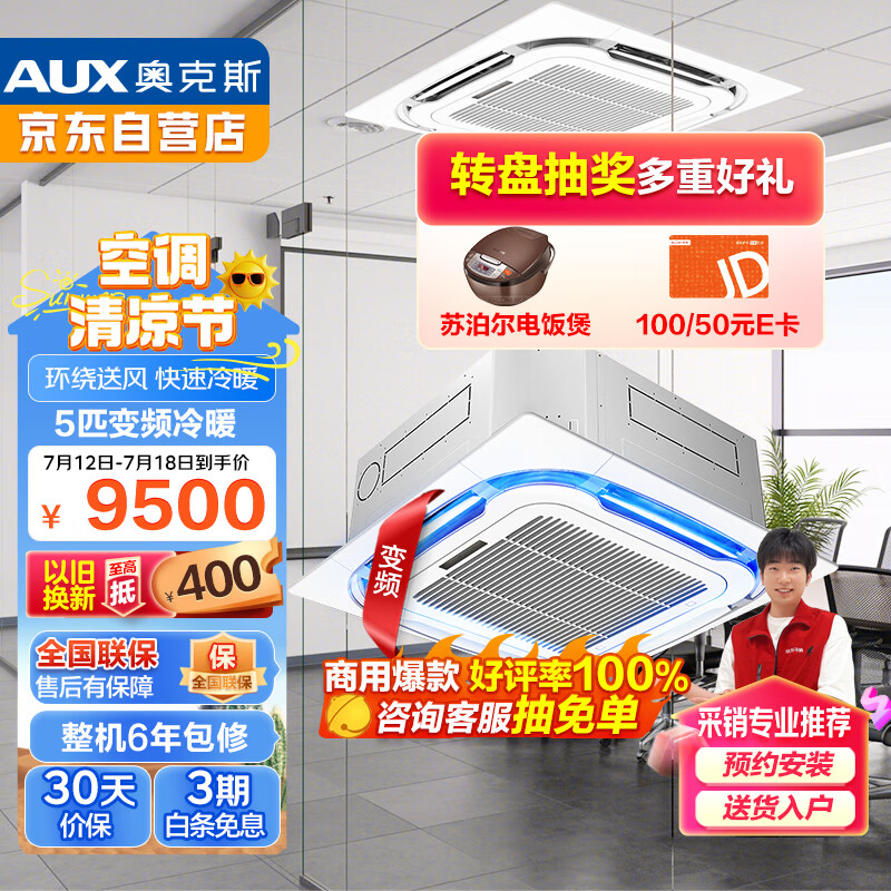 奥克斯(AUX)中央空调5匹变频冷暖天花机嵌入式吸顶机吊顶空调商用天井机380V KFR-120QW/BPR3YC2S(B2)价格:9500.00元!