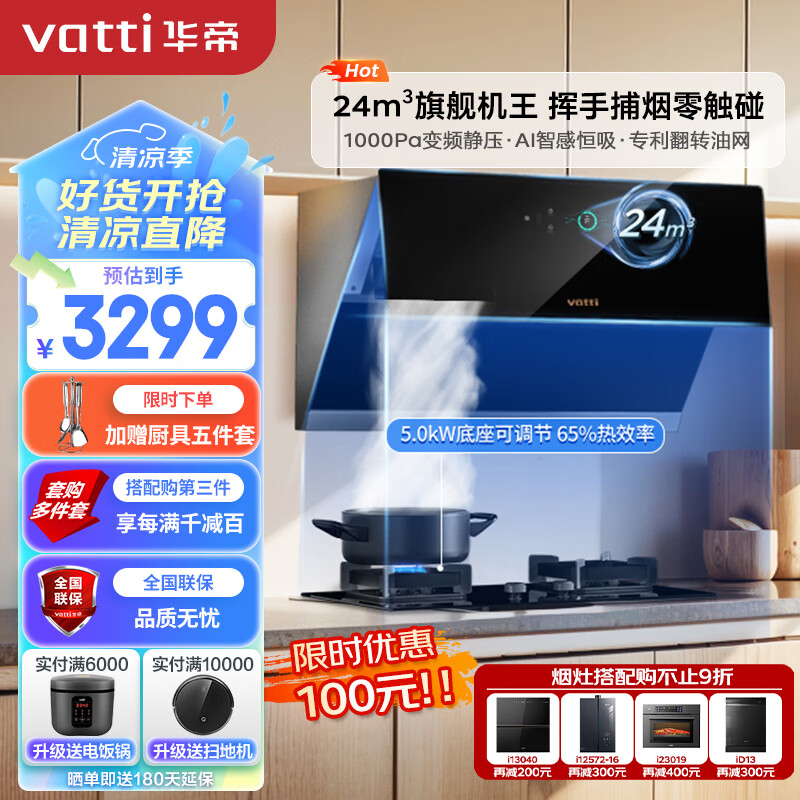 华帝(VATTI)抽油烟机家用顶侧双吸变频大吸力烟机燃气灶烟灶套装24风量自动洗侧吸灶具套装i11193天然气价格:3299.00元!