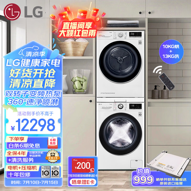 LG 容慧系列大容量洗烘套装13kg蒸汽除菌洗衣机+10kg原装进口变频热泵遥控FCV13G4W+RH10V9AV4W价格:11599.00元!
