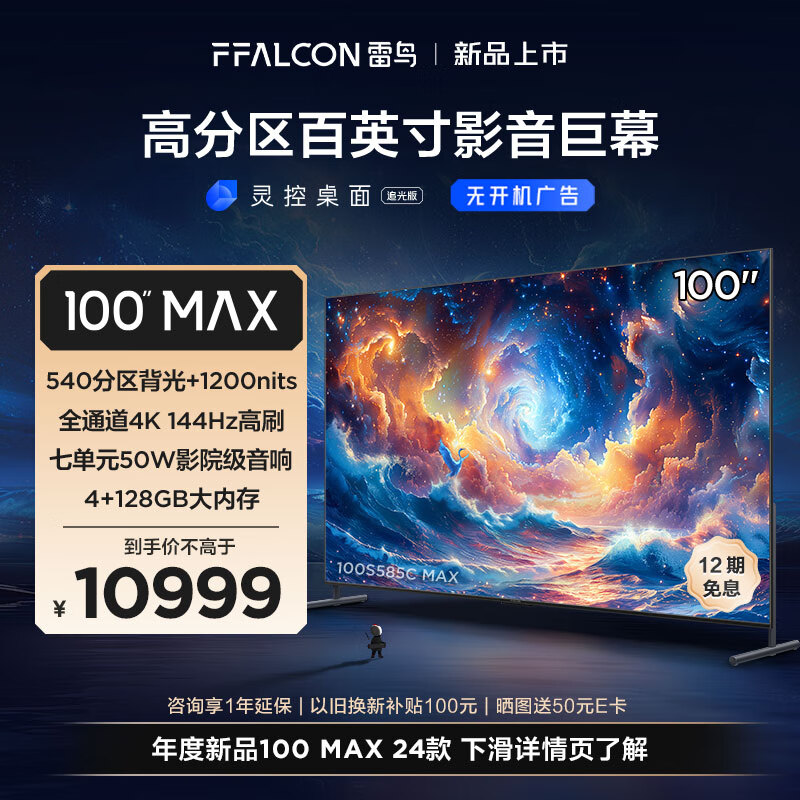 FFALCON雷鸟 100MAX 24款 100英寸巨幕电视 全通道4K144Hz 4+128G 540分区 智能液晶会议平板100S585C MAX价格:11999.00元!
