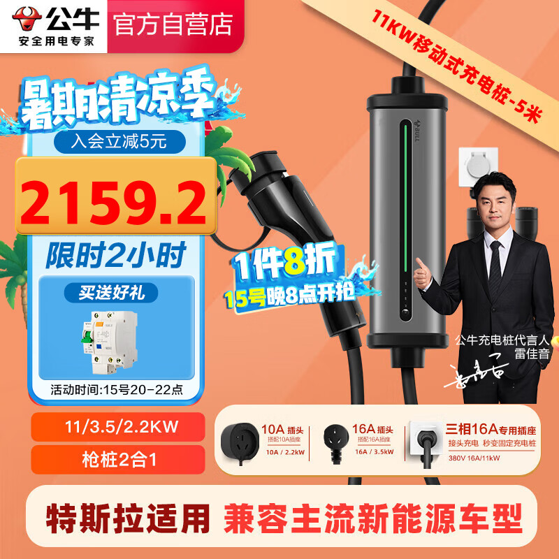 公牛(BULL)便携式充电桩充电枪随车充适配于小米su7汽车比亚迪极氪等3.5/11KW枪桩2合1固定便携两用 5M价格:2699.00元!