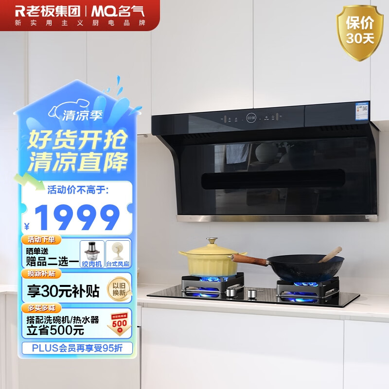 名气(MQ)老板抽油烟机7字型家用烟灶套装顶侧双吸23风量吸油烟机大吸力灶具套装燃气灶天然气A5505+6510B价格:1899.00元!