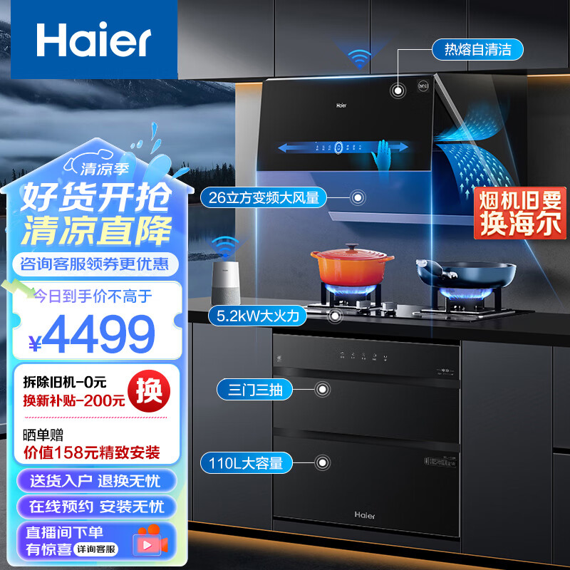 海尔(Haier)抽油烟机 烟灶消三件套 变频 26立方大吸力5.2kw大火力 110L三抽医疗级消毒柜EC911+Q2BE3天+EB031价格:4499.00元!