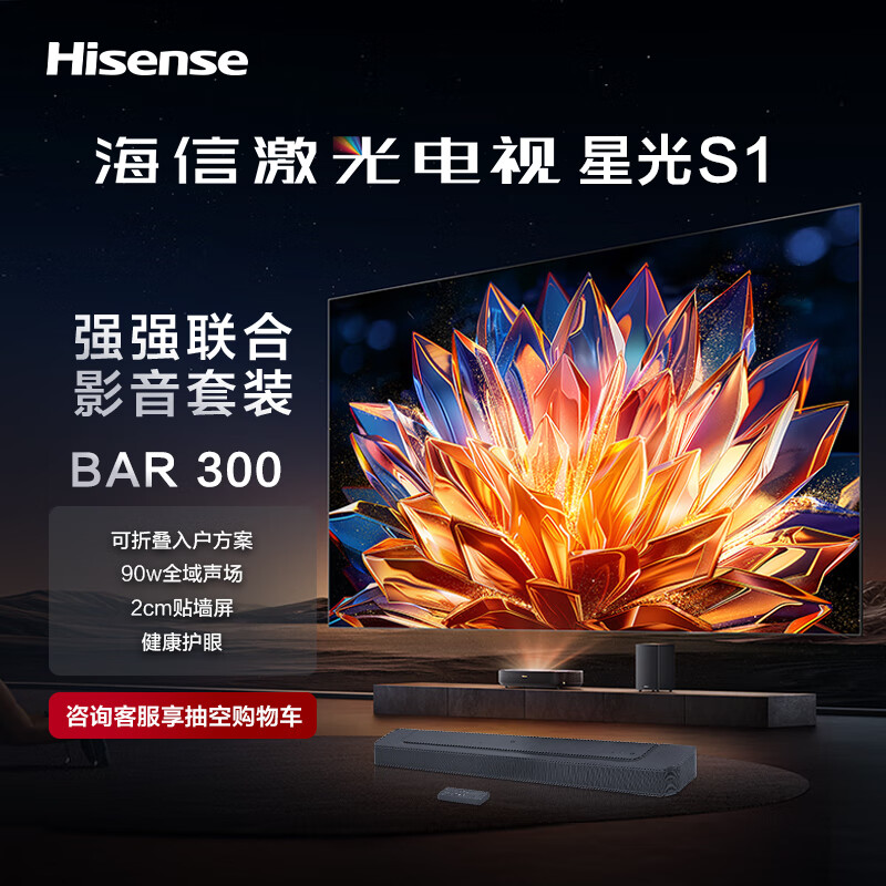 海信璀璨激光电视 星光S1+BAR300沉浸追剧套装 100英寸 4K超高清超薄巨幕 护眼电视可折叠入户价格:22098.00元!