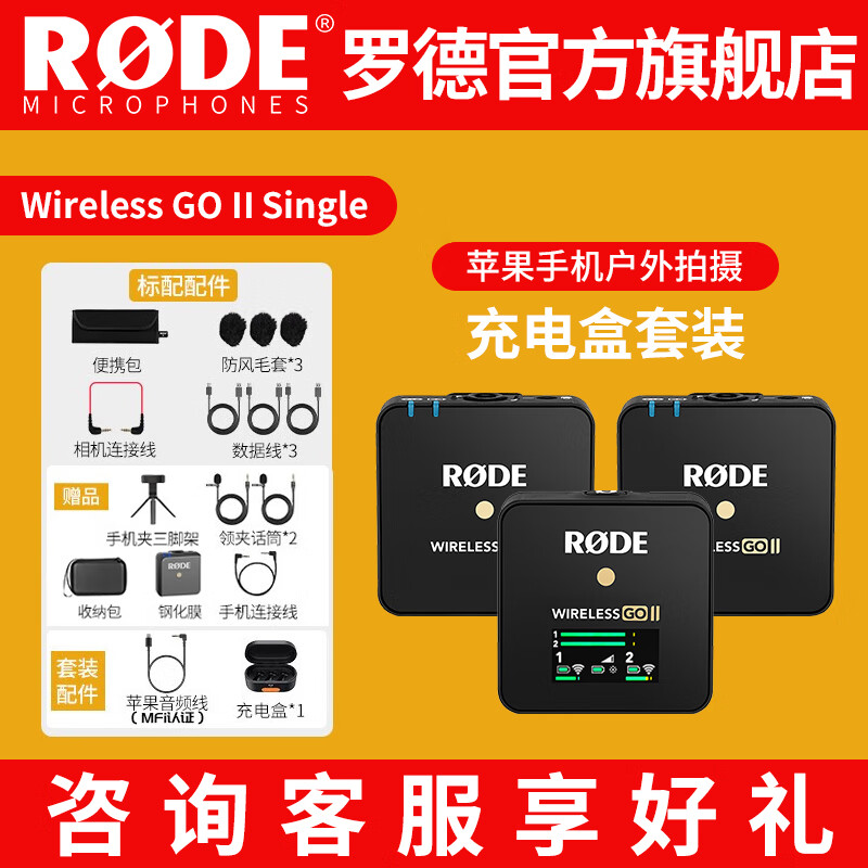 RODE 罗德wireless go II一拖二无线领夹麦克风单反手机无线小蜜蜂采访直播vlog收音 (户外充电套装)标配+户外充电盒+苹果连接线价格:2865.00元!