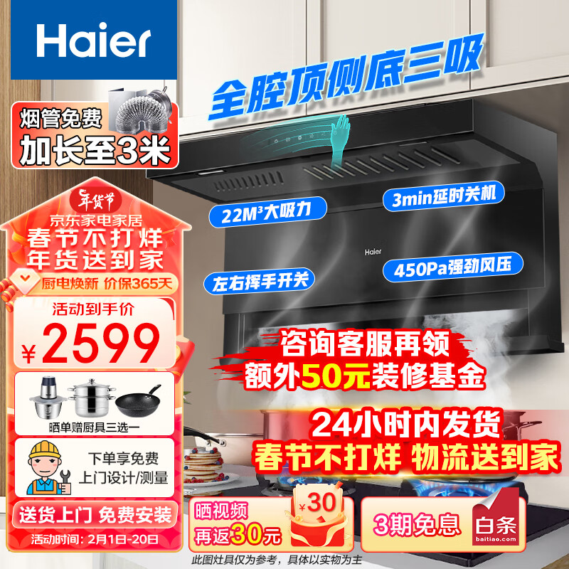 海尔(Haier)抽油烟机燃气灶套装 7字型顶侧双吸挥手智控 22立方大吸力吸脱排油烟机EC710+5.2KW灶Q2BE56[家电]价格:2799.00元!