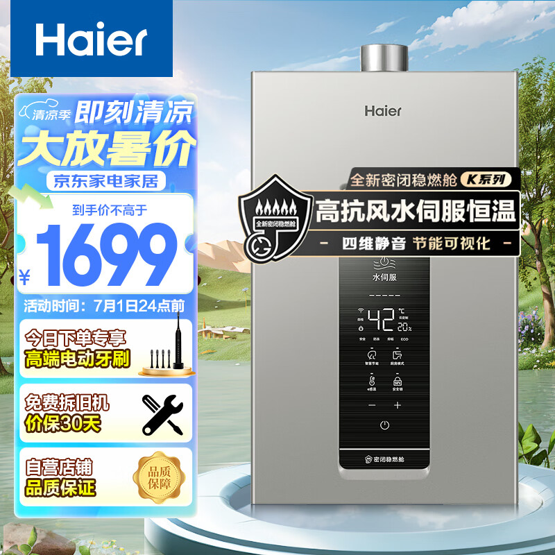海尔(Haier)16升【K系列KL3】燃气热水器天然气水伺服恒温 一级静音全新密闭稳燃舱JSQ31-16KL3U1【以旧换新】价格:1799.00元!
