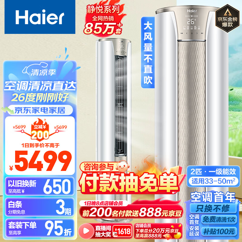 海尔(Haier)3匹 静悦新一级变频省电客厅空调立式柜机 立式空调 KFR-72LW/28KCA81U1(冰雪白) 以旧换新价格:5499.00元!