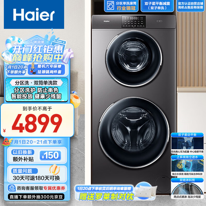 海尔(Haier)滚筒洗衣机全自动 双筒分区单洗款 4+9公斤 母婴儿童内衣 以旧换新家用大容量 XQGF130-B1258U1价格:4899.00元!