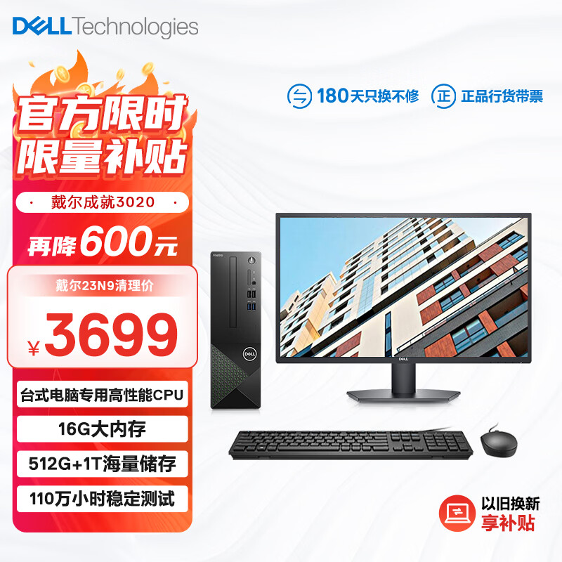 戴尔(Dell)成就3020 台式电脑主机(酷睿13代i3-13100 16G 512GSSD+1TB)27英寸大屏显示器 高性能CPU价格:3699.00元!