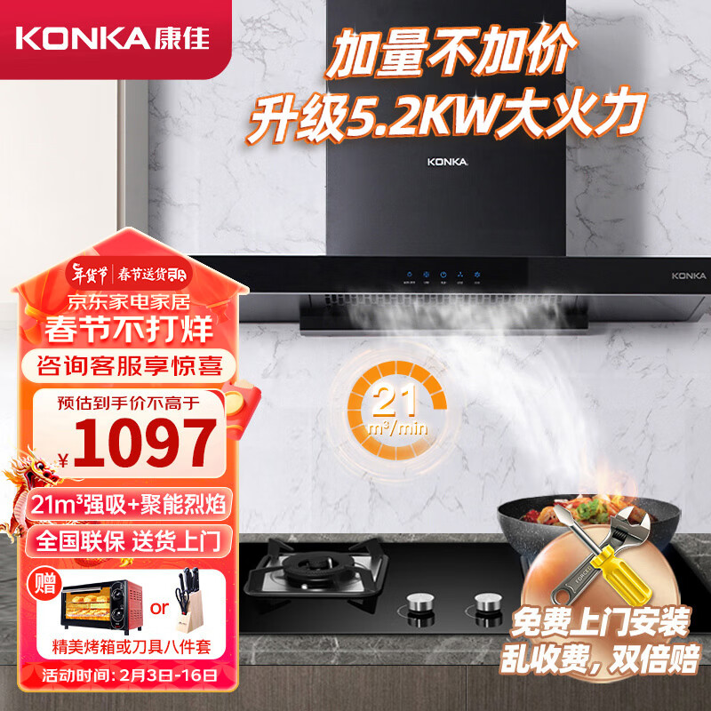 康佳(KONKA)抽油烟机燃气灶具套装 家用欧式21m3/min大吸力挥手自清洗烟灶两件套装 KT55+B500F(天然气)价格:1097.00元!