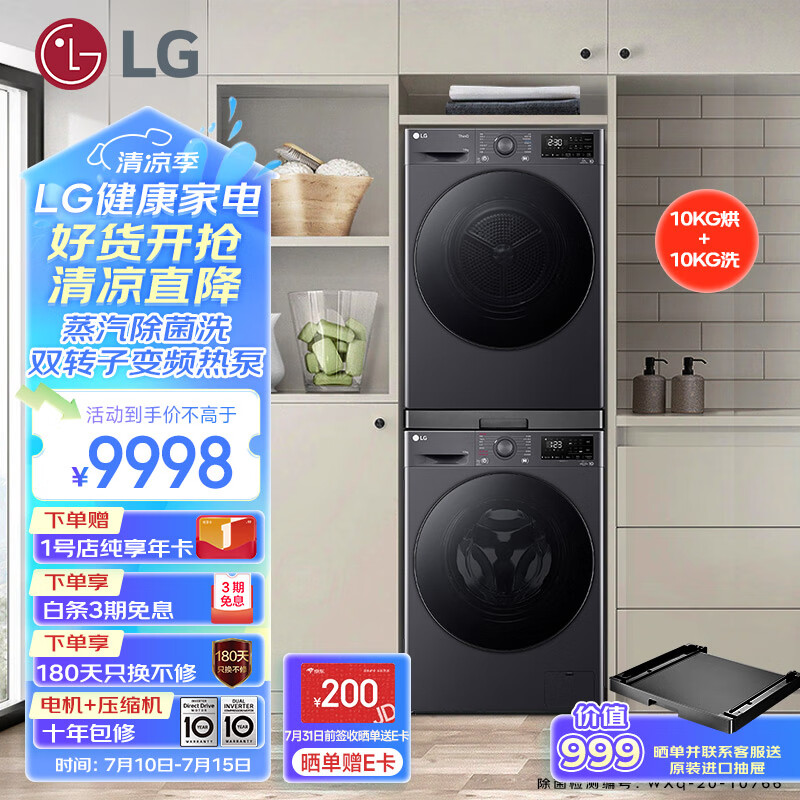 LG星云黑洗烘套装 10kg蒸汽除菌洗衣机+10kg进口双转子变频热泵烘干机家用 FCY10Y4M+RH10V3MVTW价格:9698.00元!