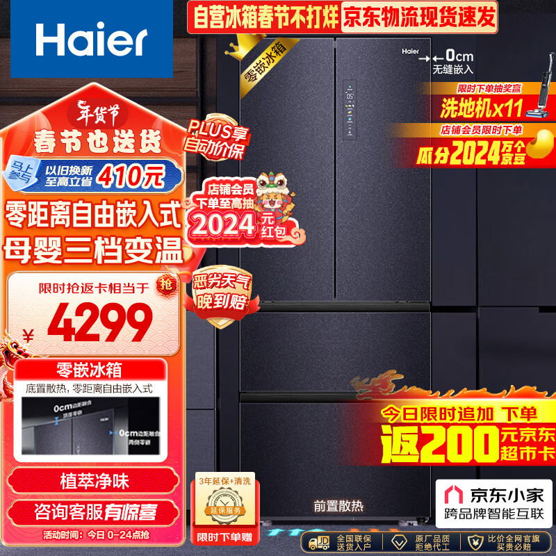 海尔(Haier)409L零距离自由嵌入法式四开多门电冰箱家用超薄零嵌入式底部散热一级能效节能BCD-409WLHFD4DB8U1价格:4499.00元!