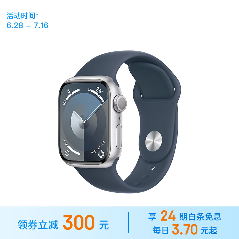Apple【24期免息】Watch Series 9智能手表GPS款41毫米银色铝金属表壳风暴蓝色表带M/L MR913CH/A价格:2999.00元!