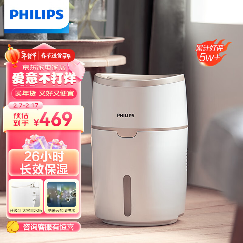 飞利浦 (PHILIPS)无雾加湿器 轻音便捷 无雾加湿器 无菌恒湿大容量 母婴健康卧室家用空气加湿 HU4816/00价格:469.00元!