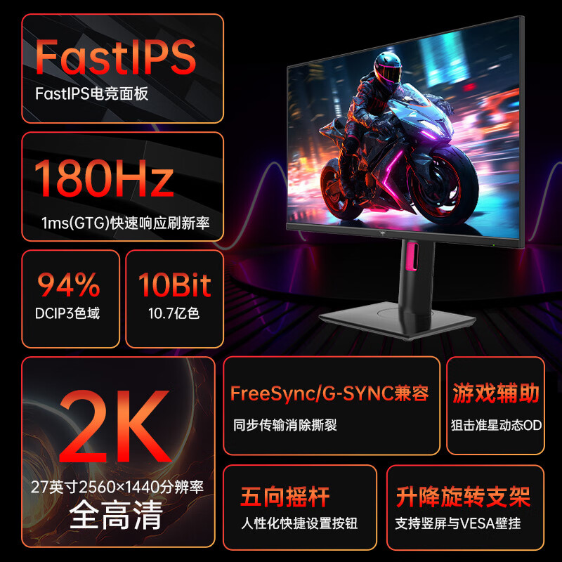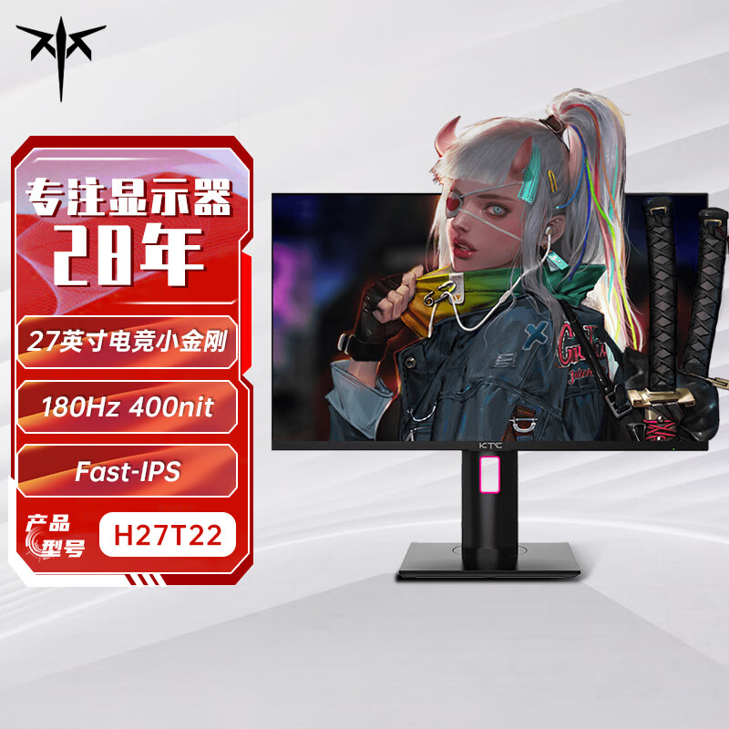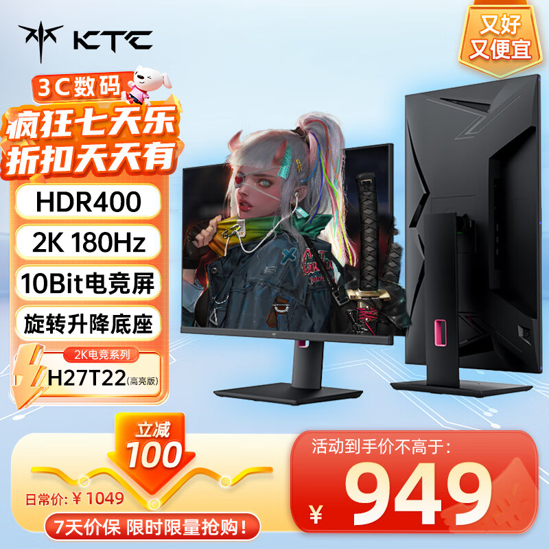 KTC 27英寸2k原生180Hz HDR400 高亮1ms快响FastIPS屏 94%P3广色域低蓝光 升降旋转 电竞显示器H27T22价格:949.00元!