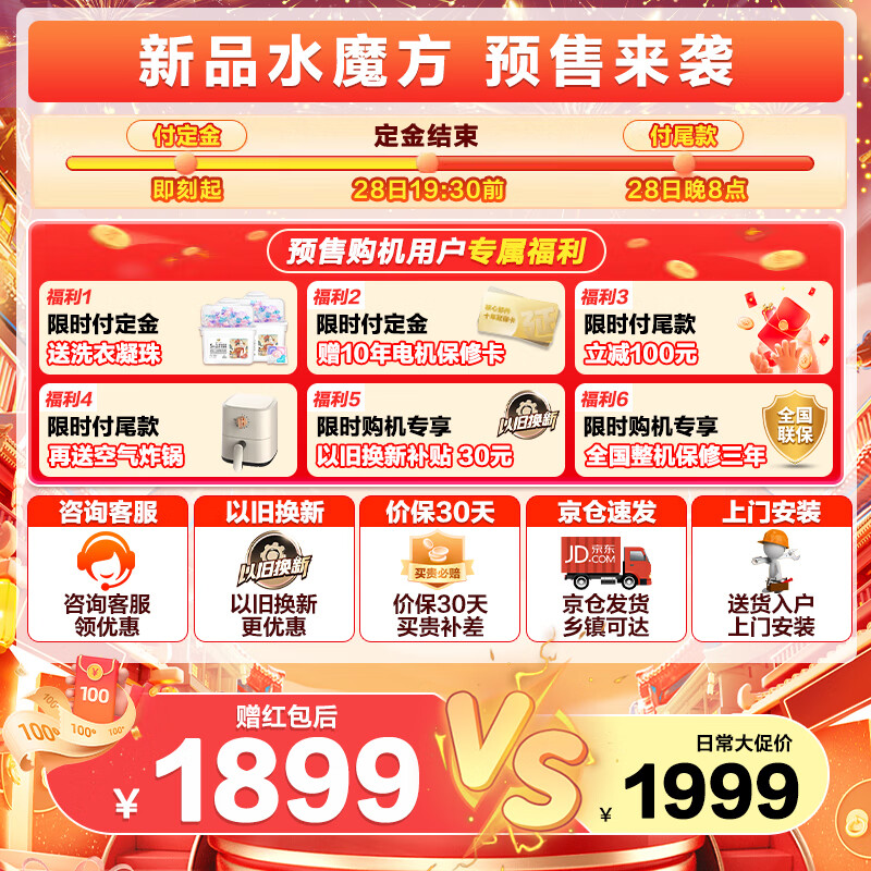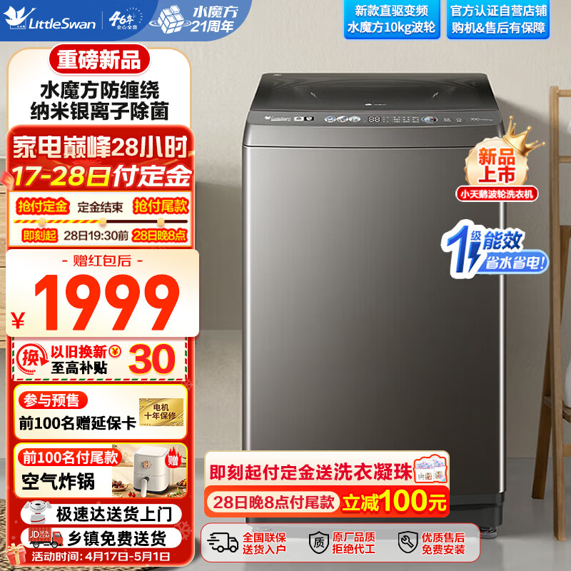 小天鹅(LittleSwan)波轮洗衣机全自动家用10公斤大容量 水魔方防缠绕 直驱变频 TB100VC180DMT价格:1899.00元!