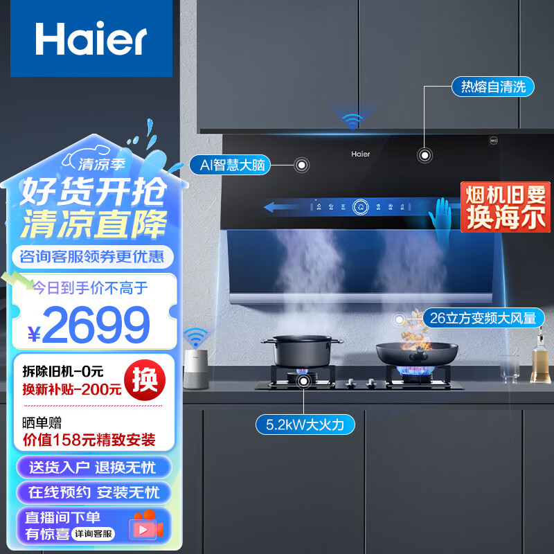 海尔(Haier)抽油烟机燃气灶 侧吸式变频烟灶套装 26立方大吸力 挥手智控 家用厨房抽烟机EC911UD+Q2BE3天价格:2699.00元!